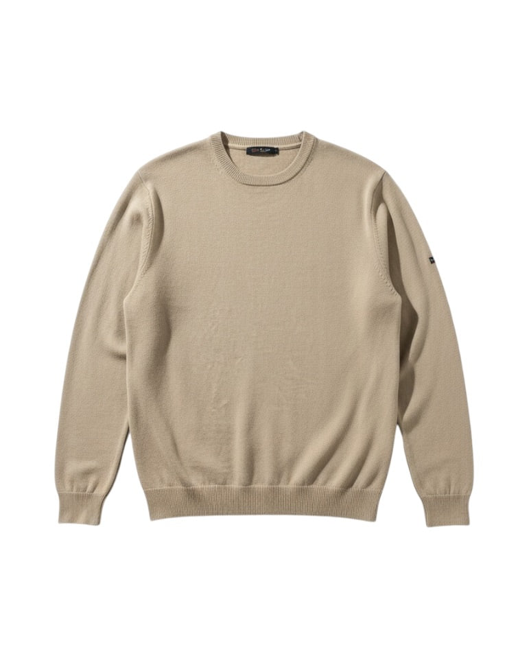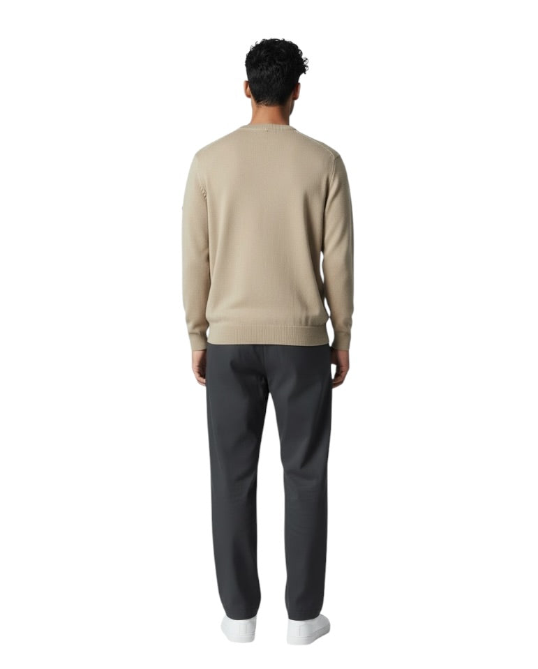 Knitted jumper presented in this season's Treehouse beige hue. Features a bound style crew neckline, elasticated waistband and cuffs and small logo patch on the arm.
