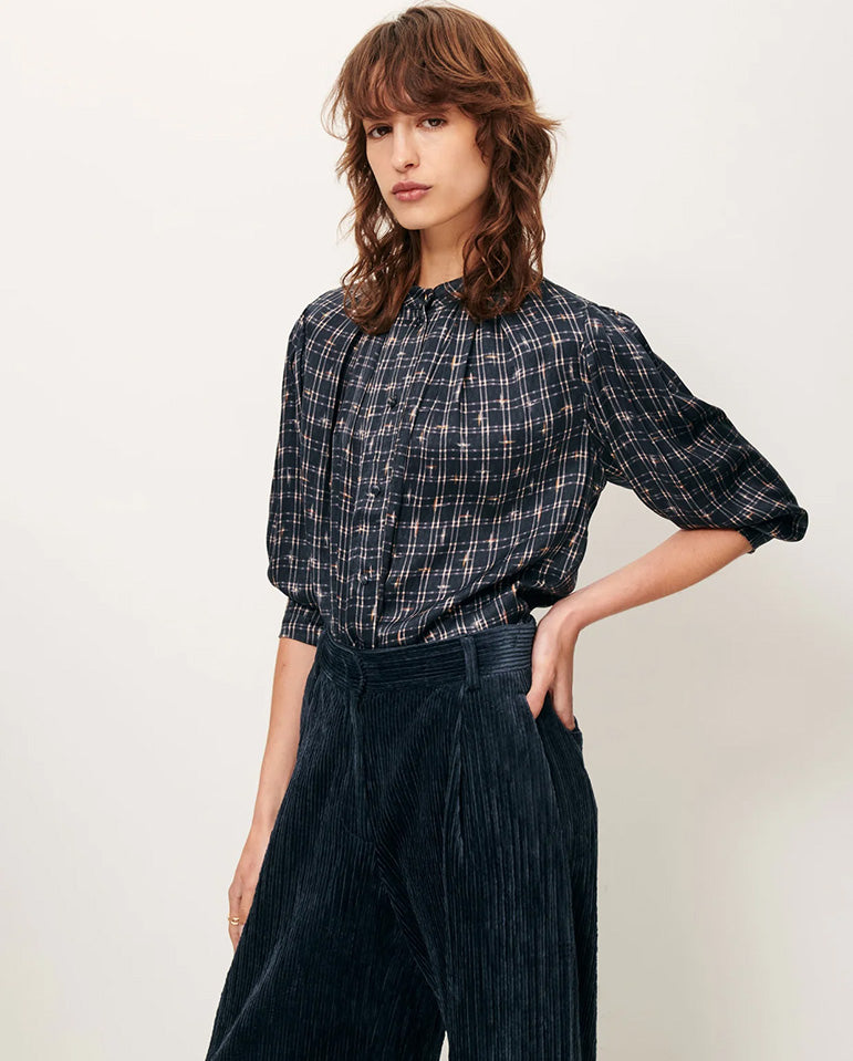 Fitted blouse with pleats in a lightweight satin chiffon, featured here in an exclusive Sessùn pattern.