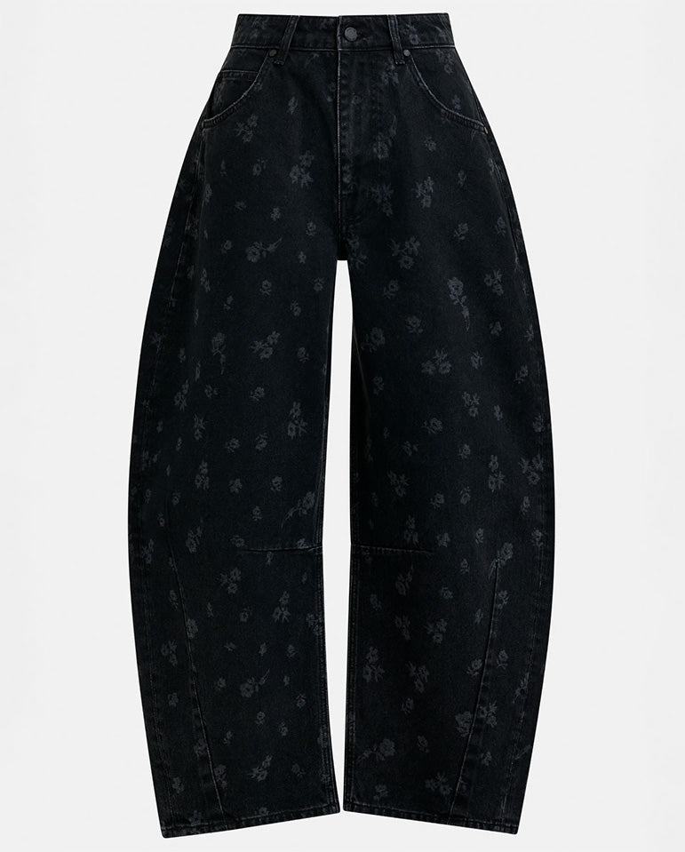 Midweight denim jeans adorned with floral motifs printed in a lighter wash. Finished with a classic five-pocket construction and a branded logo tab at the back waistband. Completed with a zip-and-button fastening and functional belt loops.