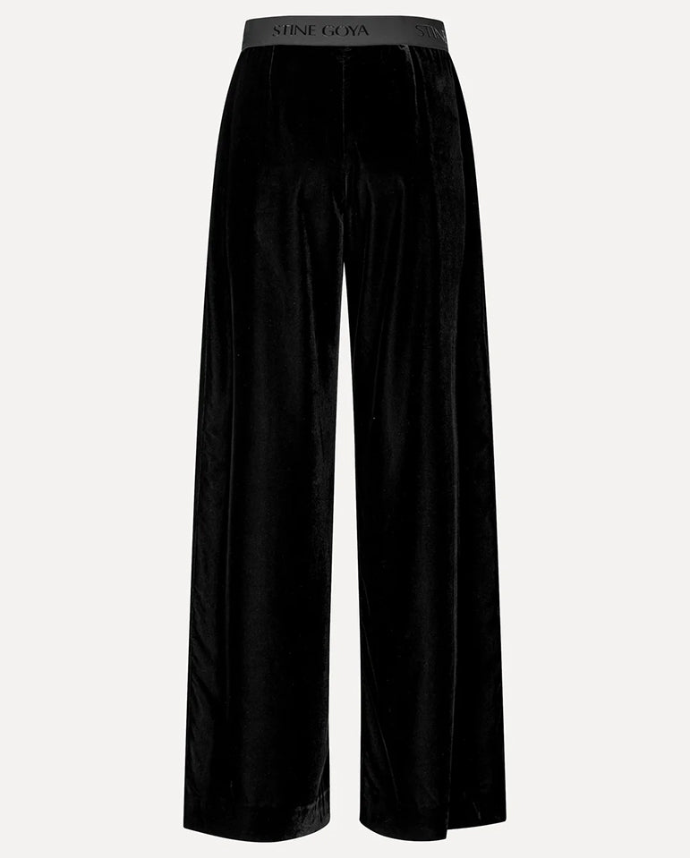 Relaxed-fit black velvet trousers with a high elasticated waistband featuring subtle STINE GOYA logo detailing. Designed with a wide-leg silhouette and a hidden side zipper.