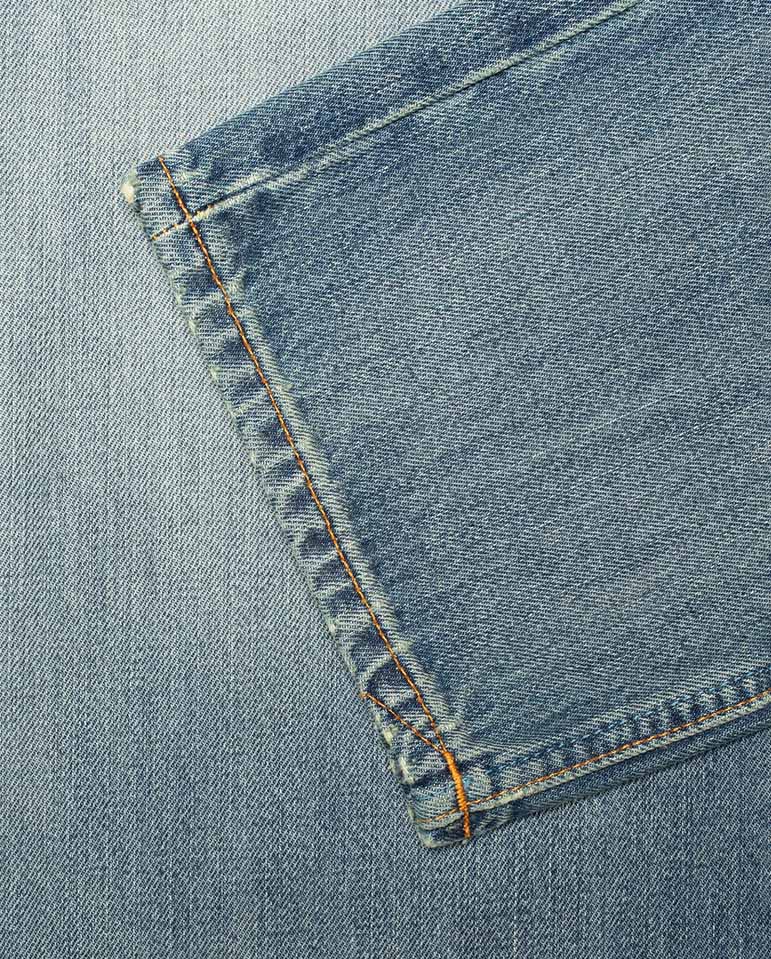 The washed-out and dusted wash retains depth, with muted highlights that reveal a flatter surface where the slubs become more visible.