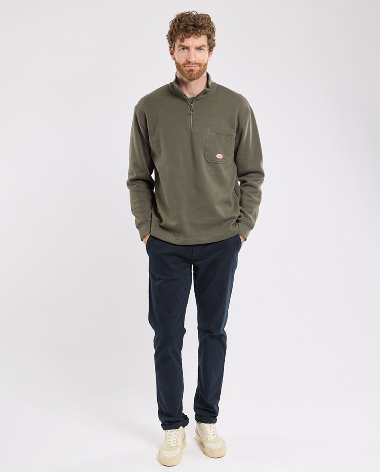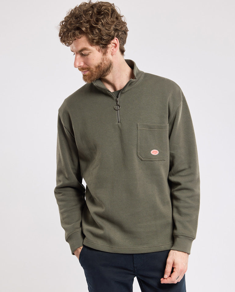 Quarter zip sweatshirt with a high neck and front patch pocket. Finished with a ribbed hem and cuffs in this seasons Chimera khaki green.