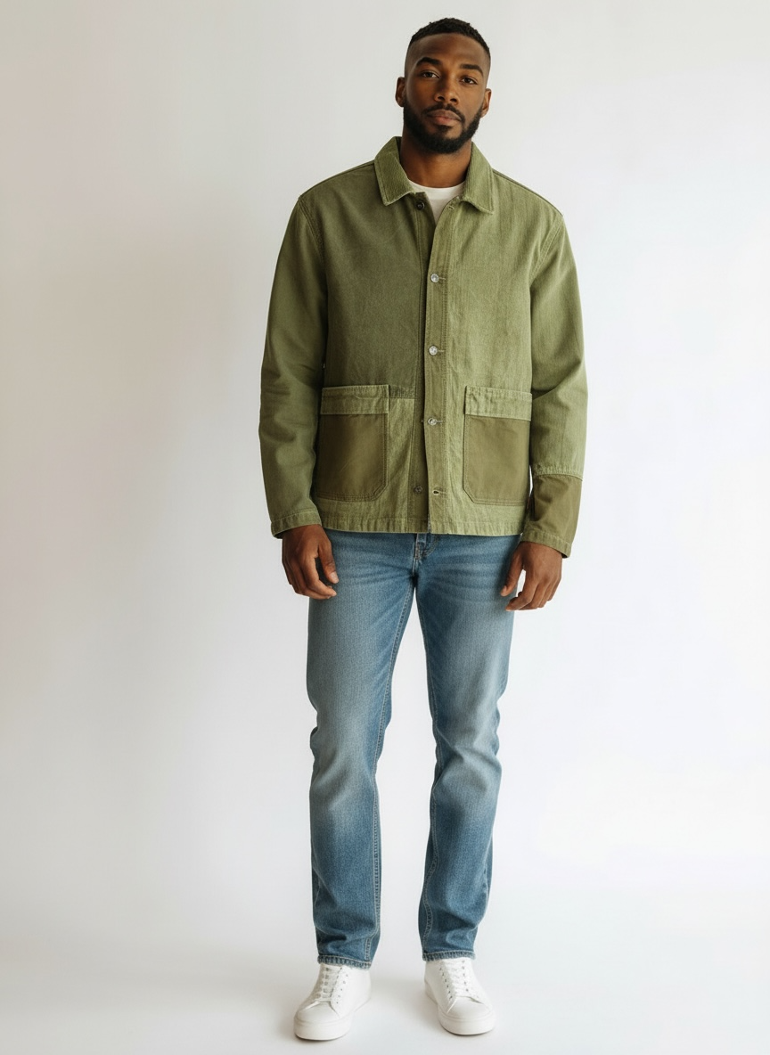 Earth People's contemporary take on a classic - the Chore Jacket. The O'Rourke Jacket features tonal contrasting greens on each side of the garment, and two large front patch pockets.