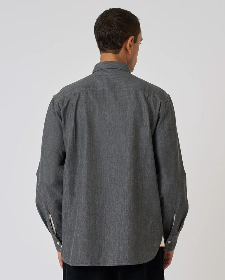 Loose-fitting shirt with an oversized square chest pocket, adjustable button cuffs and back yoke, finished with a curved hem. Also available in Blue.