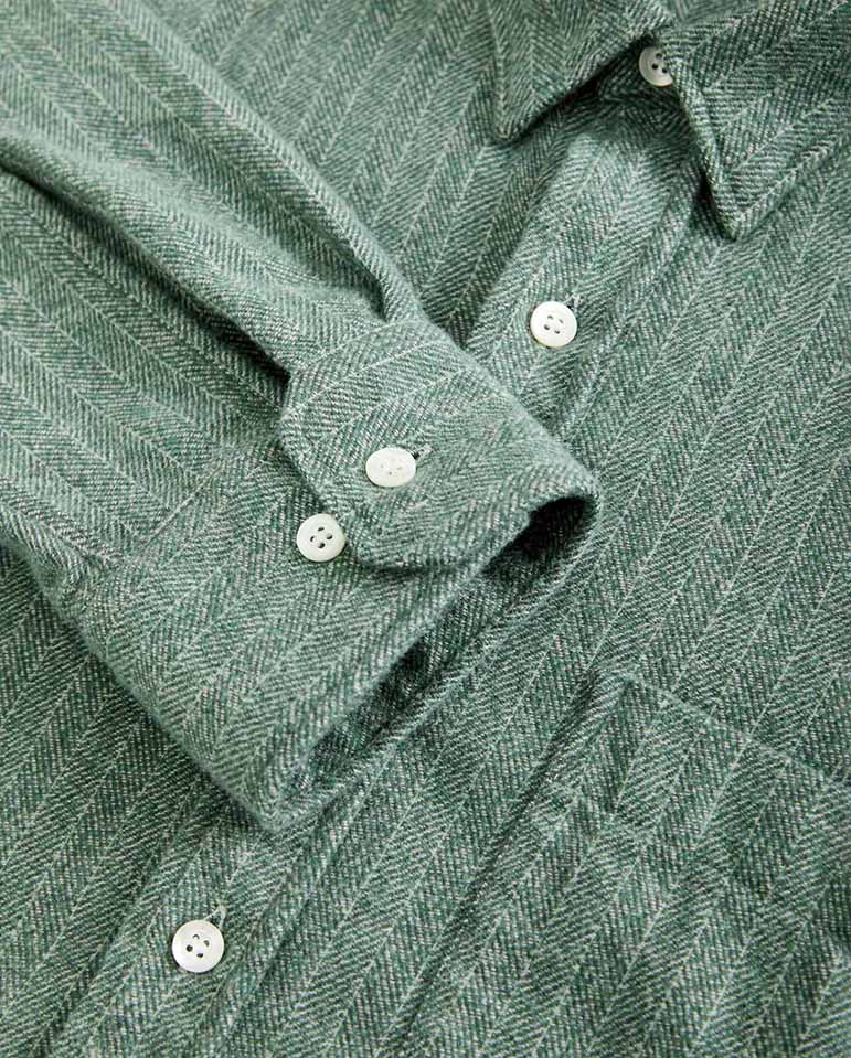 La Paz raglan sleeve 'Mirra' shirt in green herringbone offers a wintery warm feel for the cold months ahead. The fabric is midweight, cut for a regular fit and finished off with Mother of Pearl buttons.