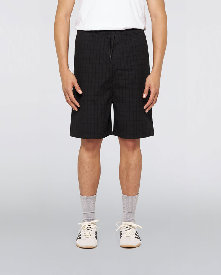 Relaxed fit, elasticated waist shorts cut in 220g/m² PFD summer compact cotton poplin. Finished with two back pockets, side pockets and a beetle woven tab label at the back pocket.