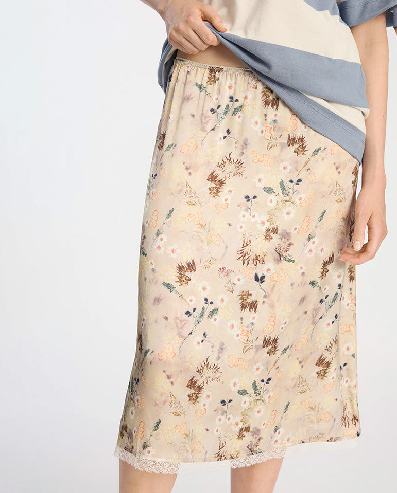 The Baia Slip is a midi skirt crafted from a lightweight viscose with an all over botanical print. The silhouette is straight with a gentle A-line shape, finished with an elasticated waistband for comfortable wear all summer long.