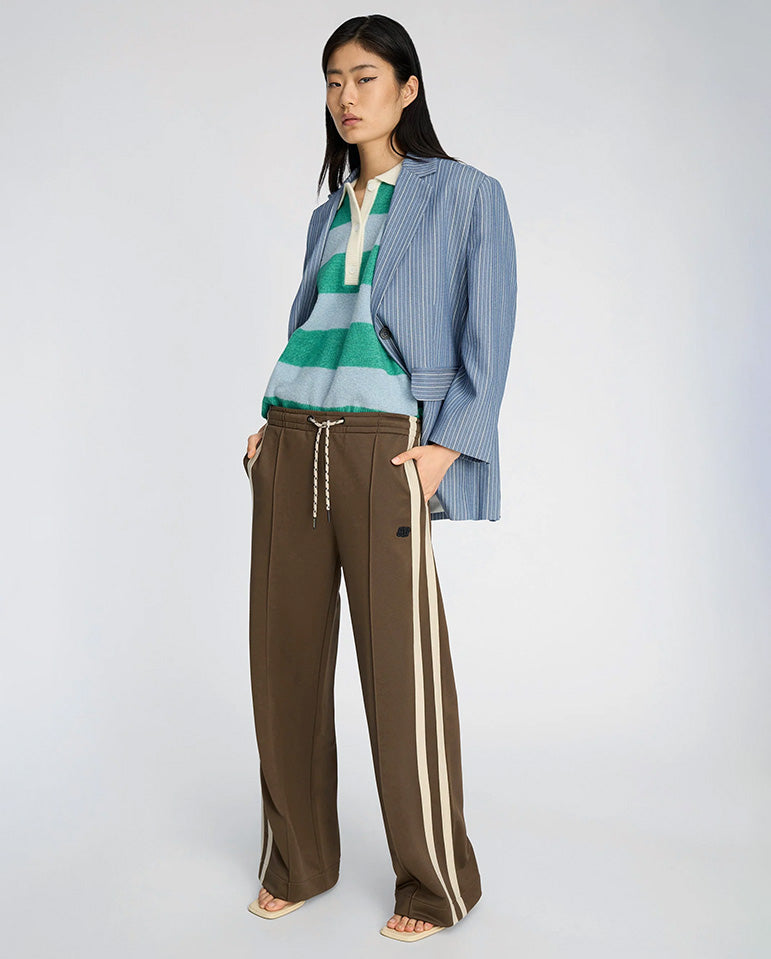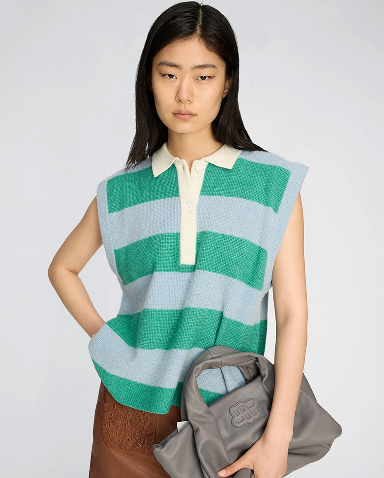 Short sleeved, knitted polo tank top with tonal block stripes and a contrasting 3/4 button placket and classic collar. The effortless silhouette makes for easy styling, suitable for both layering, or wearing as a stand alone piece.