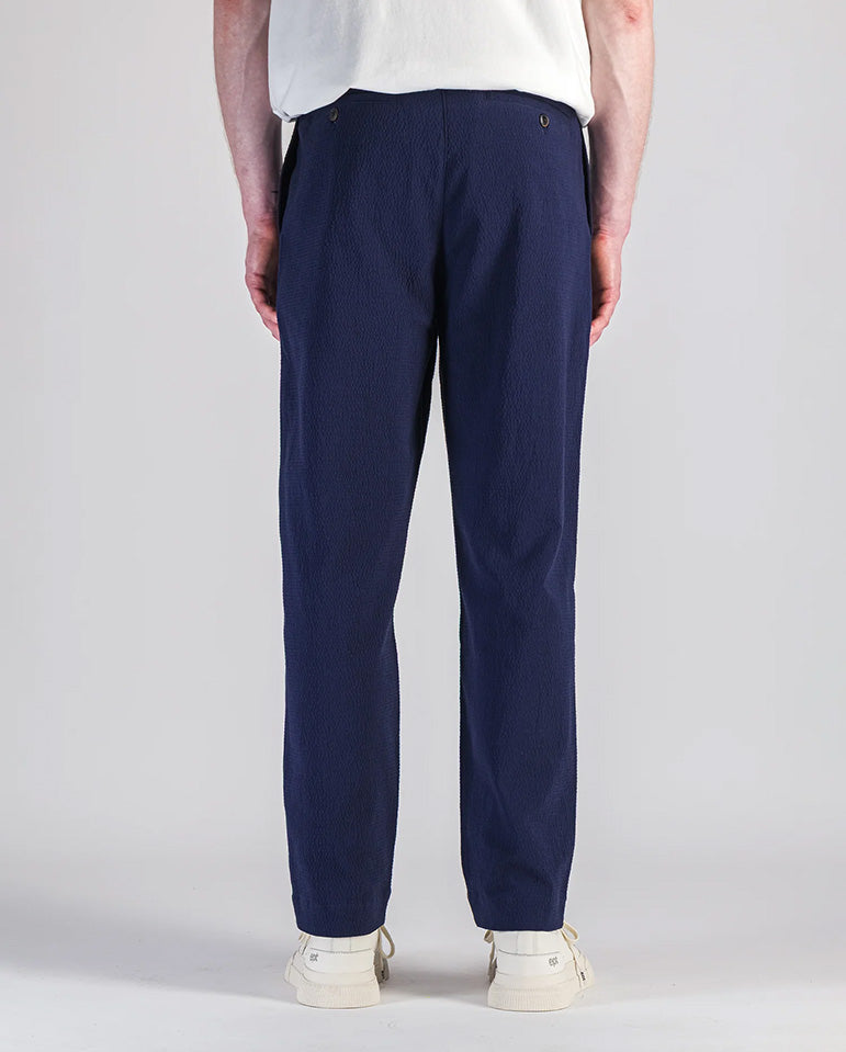 Relaxed fitting trousers in lightweight organic cotton seersucker. Designed with a wide, slightly tapered leg, side pockets, welt back pockets and a YKK metal zip fly and natural horn button.