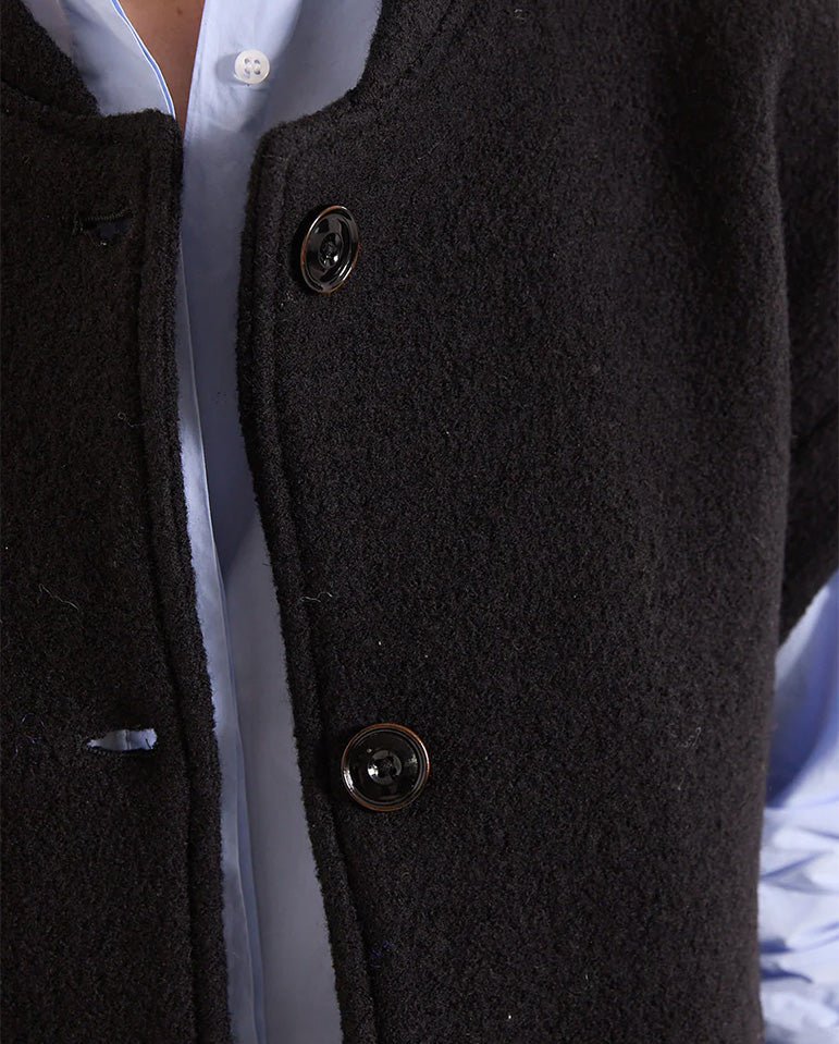 Sleeveless, unlined round jacket designed for an oversized fit. Woven in Italy from boiled virgin wool, it features pleats in the back, large piped pockets, bomber style collar and visible buttoning.