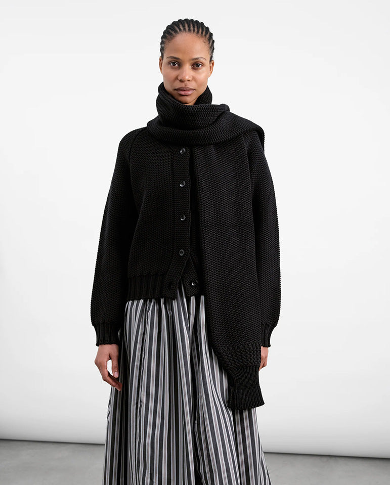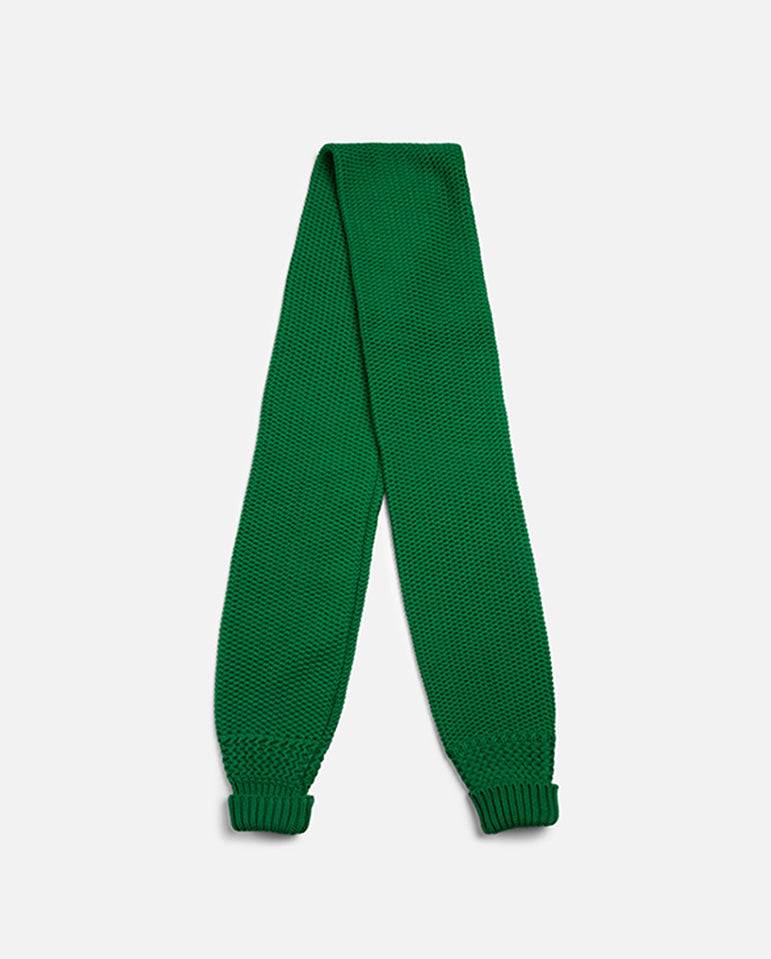 Long knitted scarf crafted in a chunky rickrack knit from cotton yarn. Designed with a sleeve-like tubular design and rib knit cuff with racking detail.