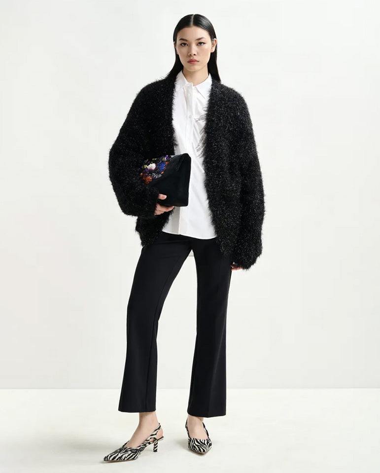 Oversized shirt with dropped shoulders and a curved hem that falls longer at the back. It features a full button fastening, classic pointed collar and a sweeping feather motif embroidered with sequins, rhinestones and beads.
