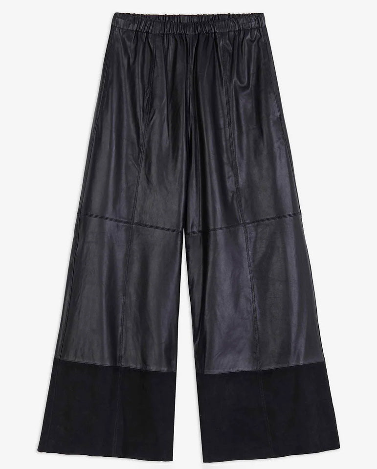 Genuine leather and suede trousers from quality Italian based brand, Alysi. Features leather and suede panelling and an elasticated waist, designed to graze the ankle.