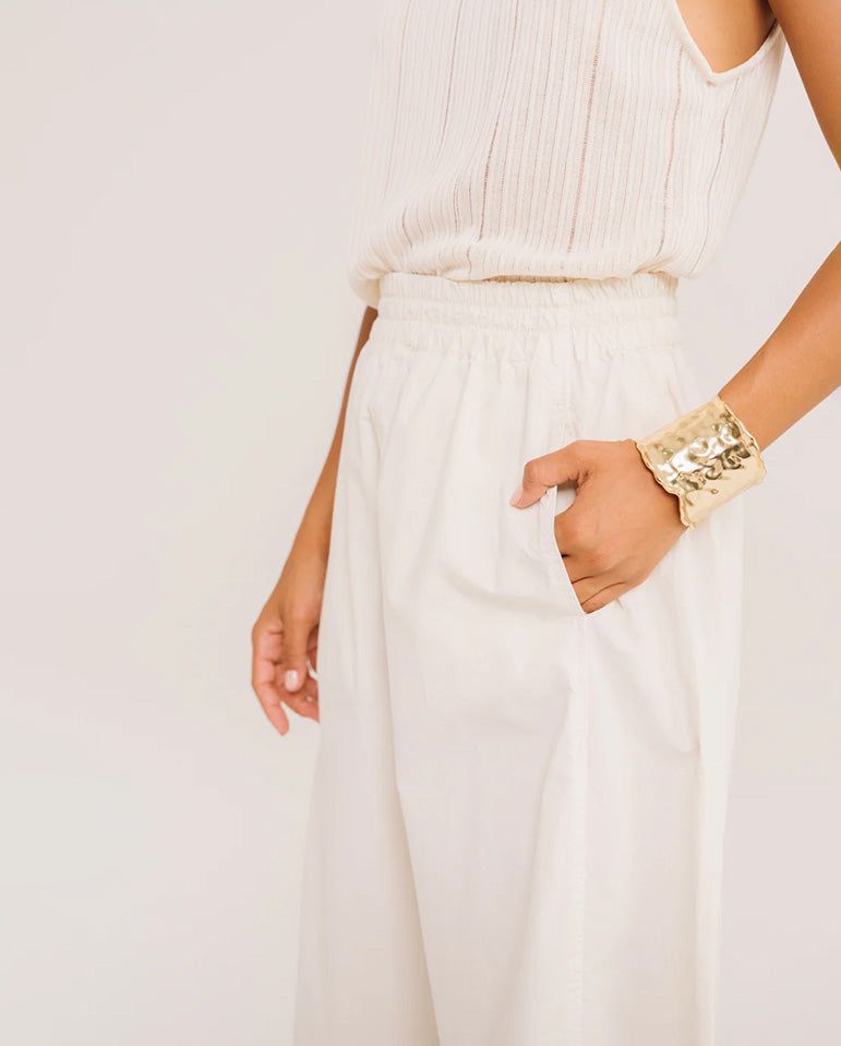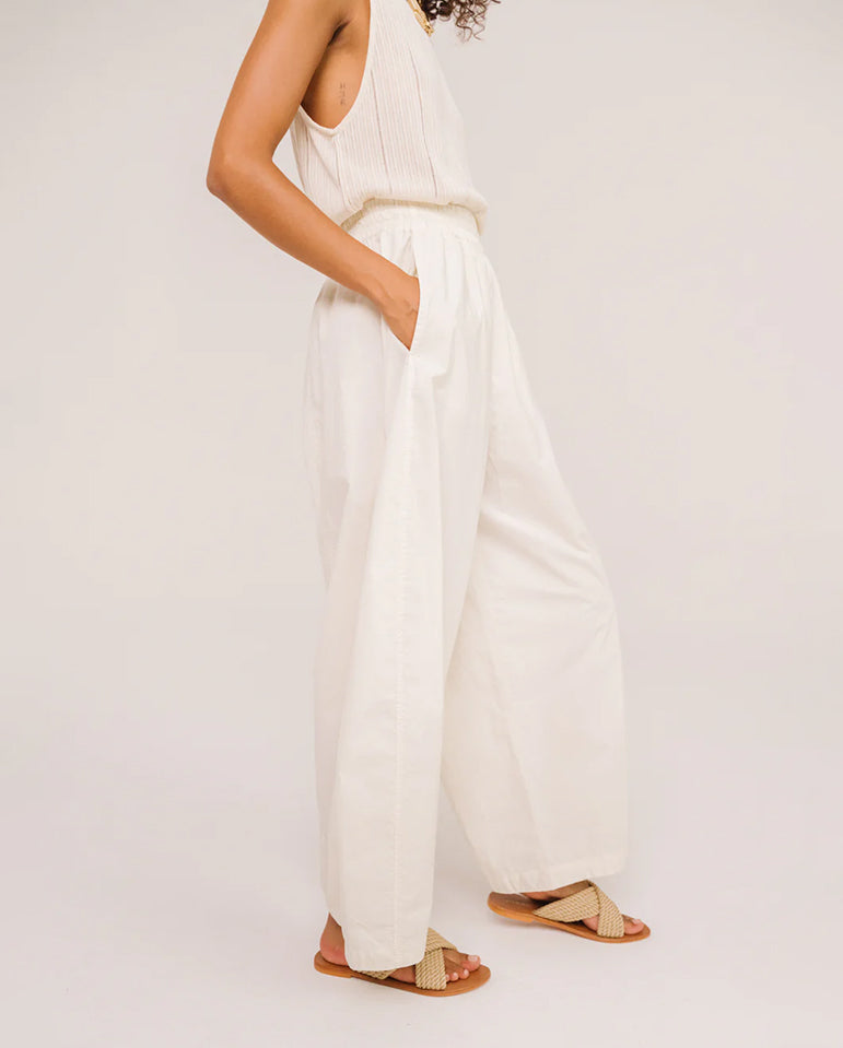 Barrel-cut trousers in light and airy cotton poplin, with a generous volume down the leg. Finished with an elasticated waist for added comfort, discreet pockets in the seams and topstitching at the front and back.