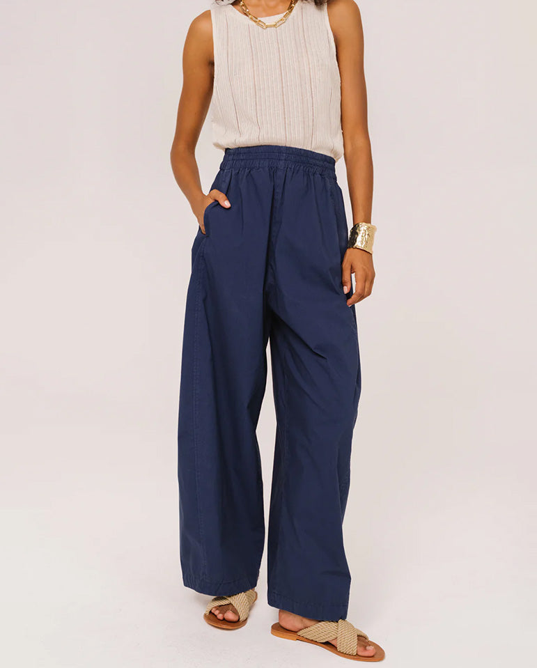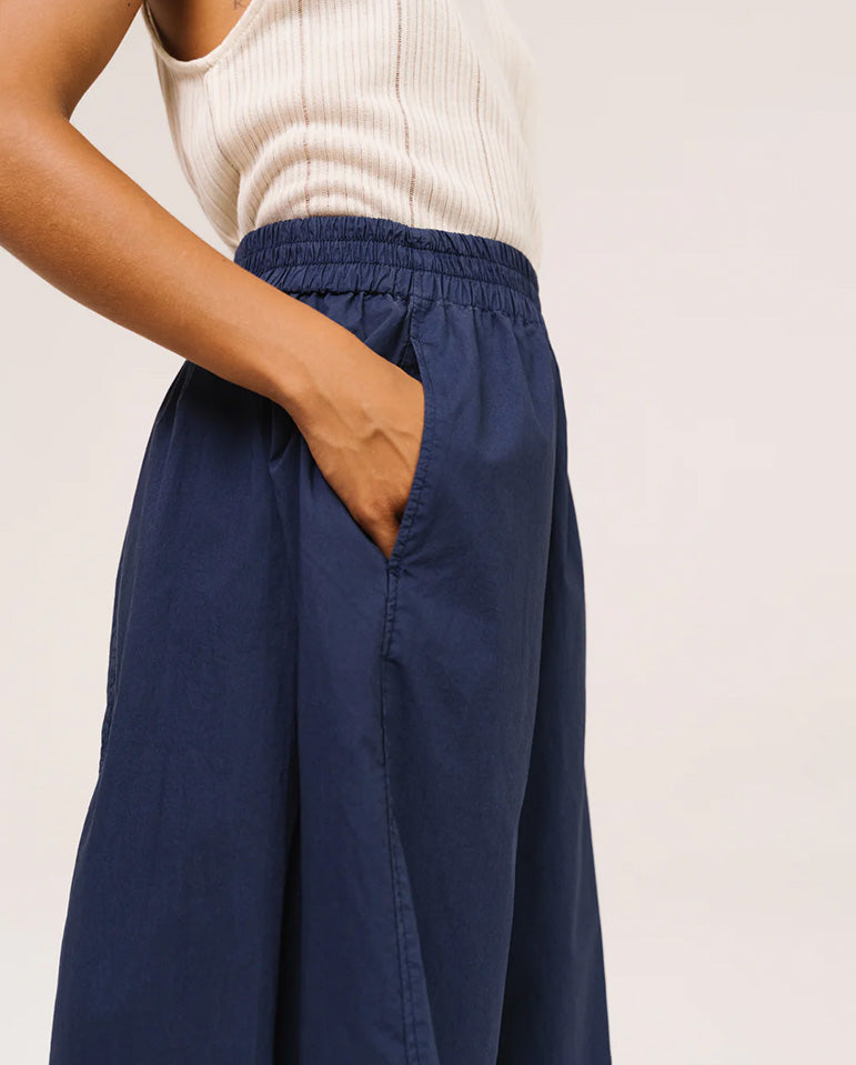 Barrel-cut trousers in light and airy cotton poplin, with a generous volume down the leg. Finished with an elasticated waist for added comfort, discreet pockets in the seams and topstitching at the front and back.