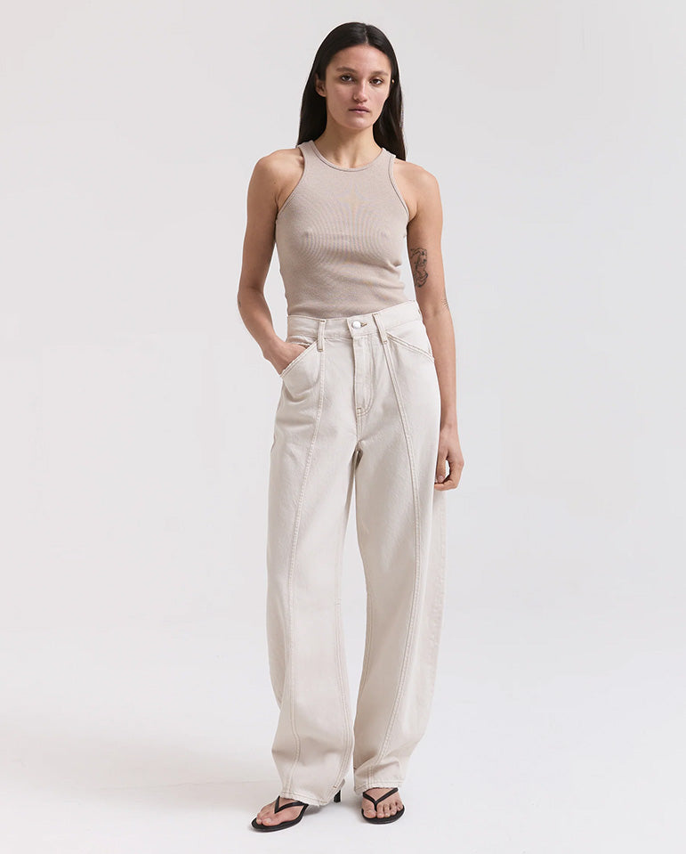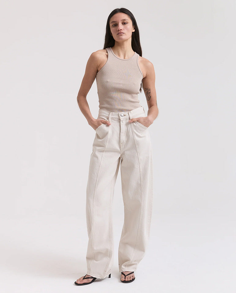 Barrel leg jeans cut from rigid Italian denim with a soft hand feel. Lido sits on the waist and has a curved horseshoe leg shape, with front flattering flat seam detail.