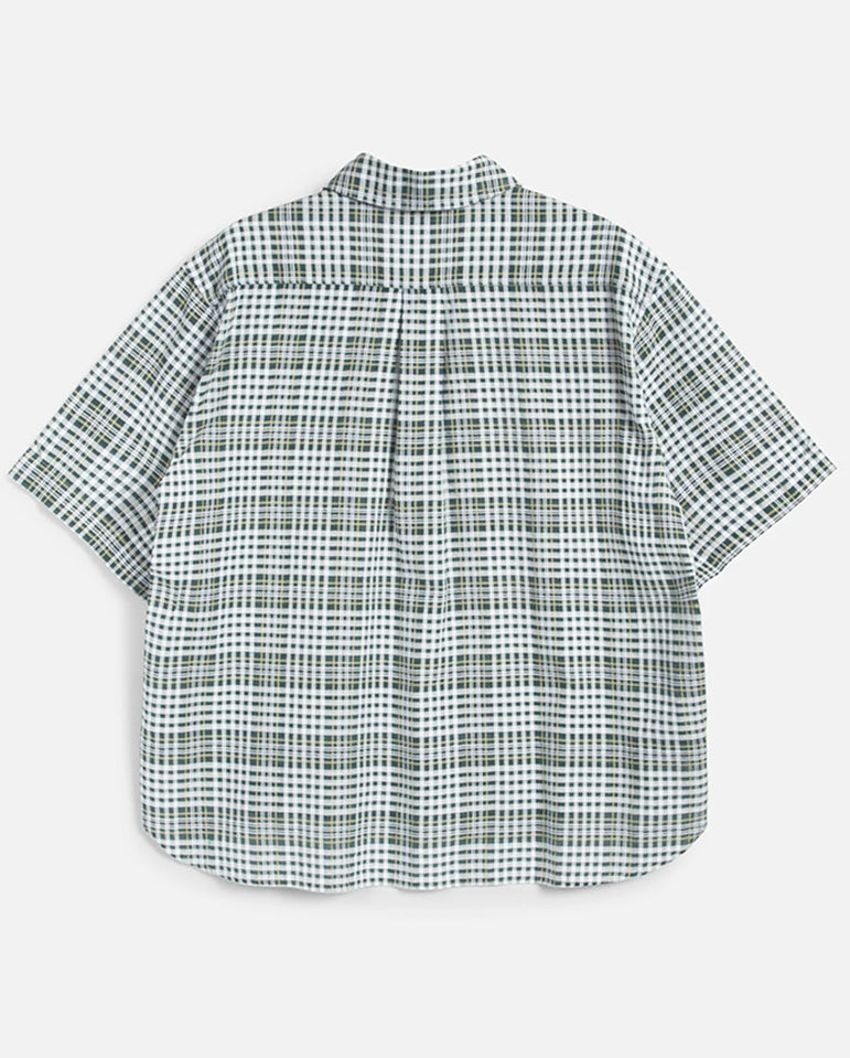 YMC short sleeve shirt cut from Portuguese organic cotton with a classic multi-tone check design. It's lightweight with a pleat detail on back, corozo button front fastening and curved hemline. Pairs perfectly with the Draped Skirt
