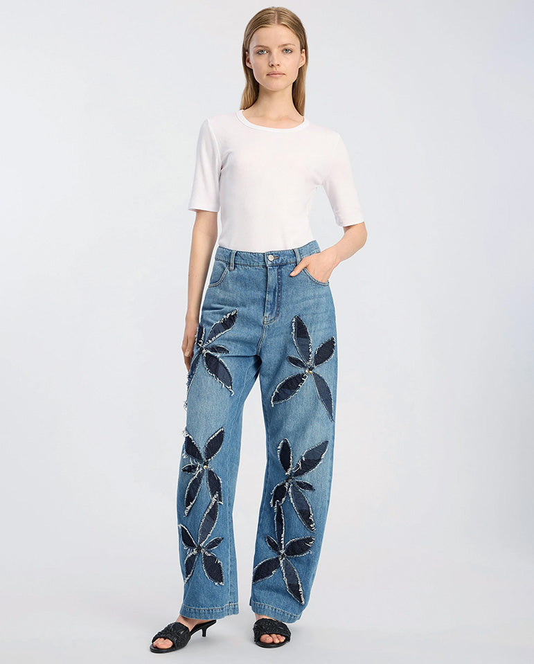 Serious flower power in the Munthe SS26 collection... Classic straight leg denim jeans with a five pocket construction and zip closure. Features large appliquéd floral motifs on the legs, cut in contrast denim. Made from 100% organic cotton. See label...