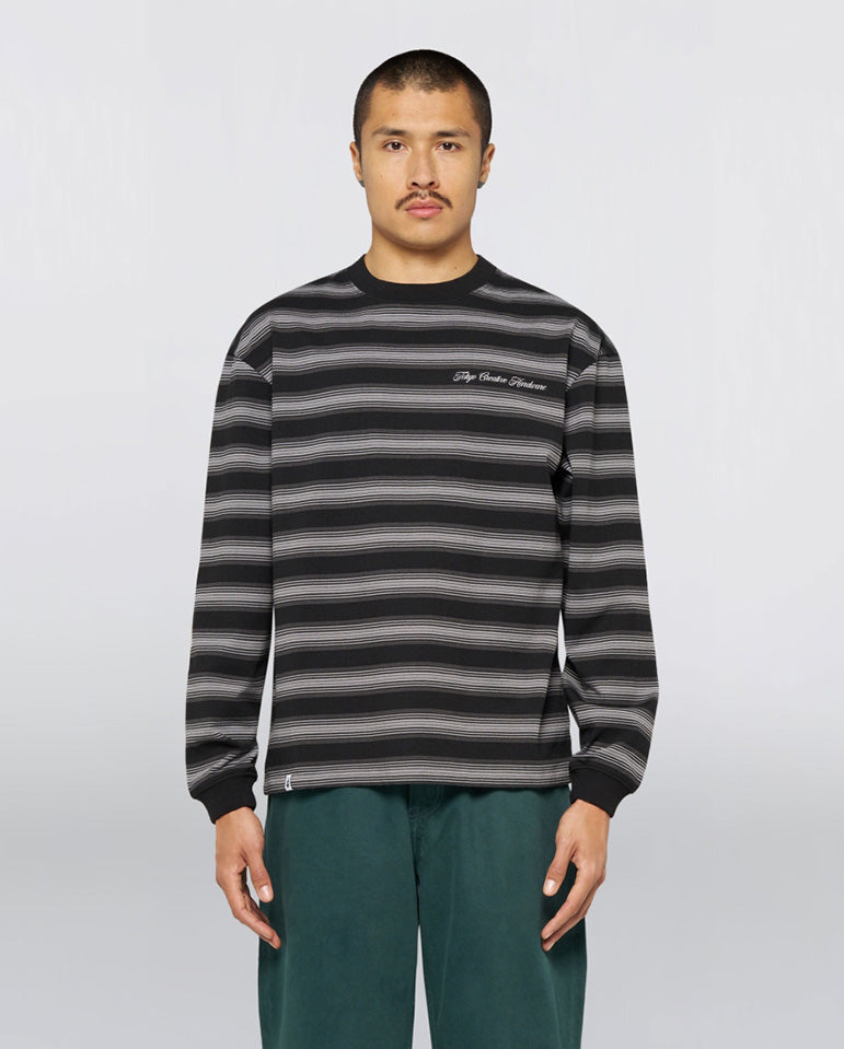 Relaxed and oversized, slump with easy into the Bolton tee... This Edwin T-shirt is designed for an oversized fit with long sleeves and a ribbed collar, featuring an all over striped pattern with a chest print and a beetle woven...