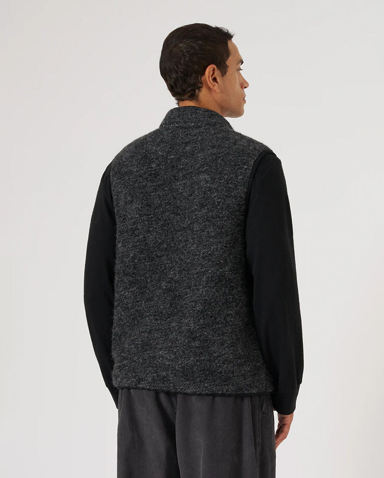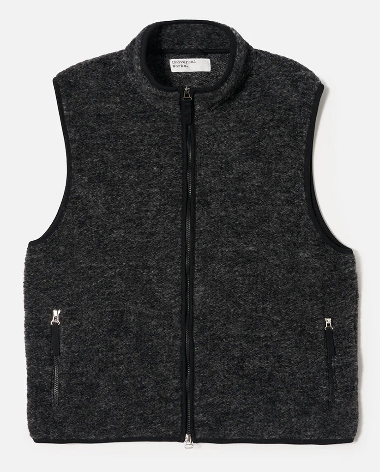 Keep your body warm and your arms free with this ultimate layering piece. Universal Works funnel necked climbing gilet with a zip front closure and zip pockets to keep life's little essentials safe. Made from 80% Wool, 20% Recycled Polyester....
