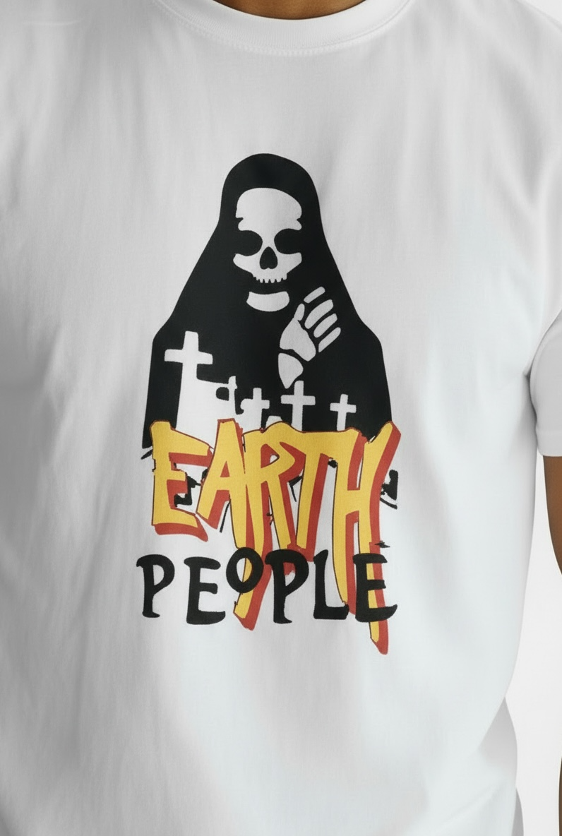Add an Earth People graphic into your daily tee rotation... White T-shirt with Earth People skull and graveyard graphics on the front, designed for a slightly oversized fit. Finished with a bound style neckline and hem. Size down it's a...