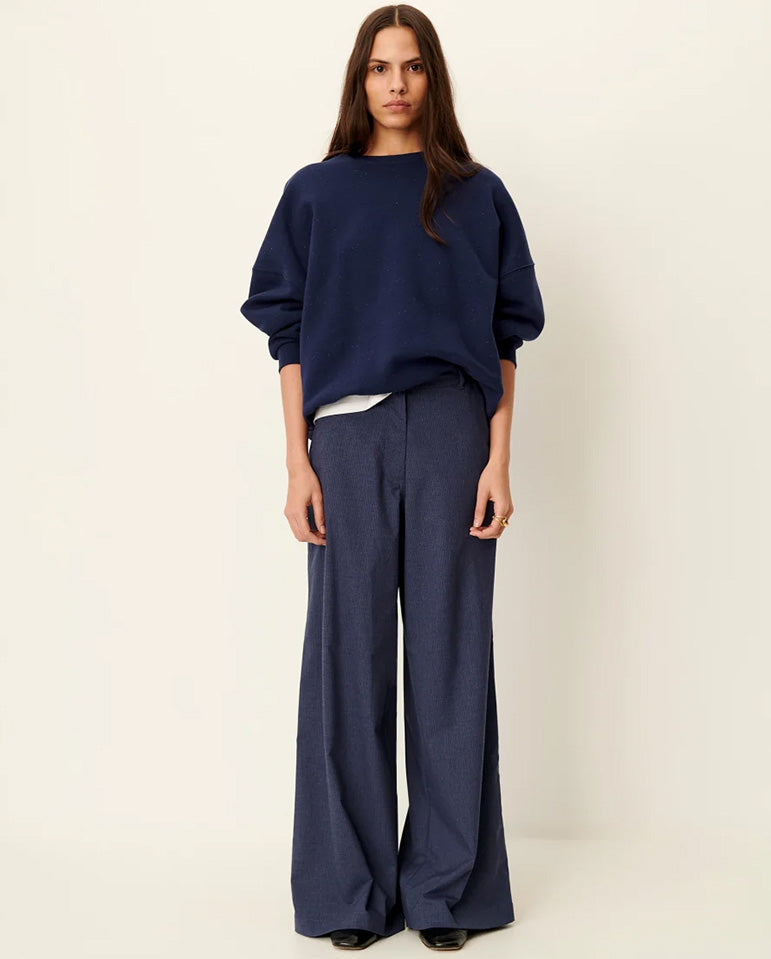 Achieve smart casual with ease, with the help of Sessùn... Flared trousers in heathered tailoring fabric with thin tennis stripes. Designed for a high waisted fit with a concealed zip and button fly closure, front slash pockets and back patch...