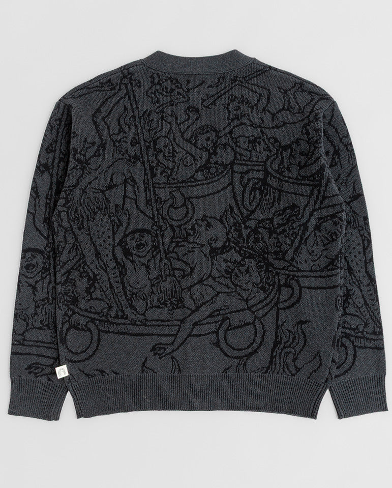 Don't let your style take the hit when you get chilly, try Heresy's Hades Cardi. Jacquard knitted cardigan designed for a relaxed fit with a V neckline, gun metal buttons and Arch label on the side seam.
