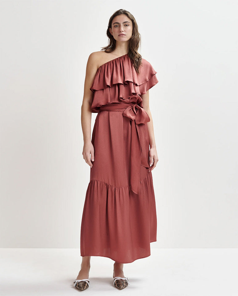 Add volume and movement to your occasion with the cascading ruffles of the Hoenix dress... Maxi dress with a cinched waist, accentuated by a self-tie belt, enhances the figure offering an airy fit. The tiered hemline adds subtle texture, making...