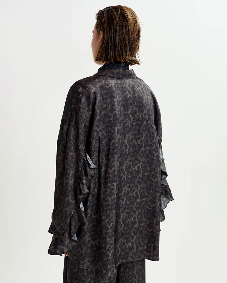 Live in print, it's the Essentiel Antwerp way... Leopard-print shirt designed for an oversized fit with dropped shoulders and statement ruffle detailing along the sleeve seams. This shirt has a classic button down fastening, cut from a lightweight, non-stretchy fabric....