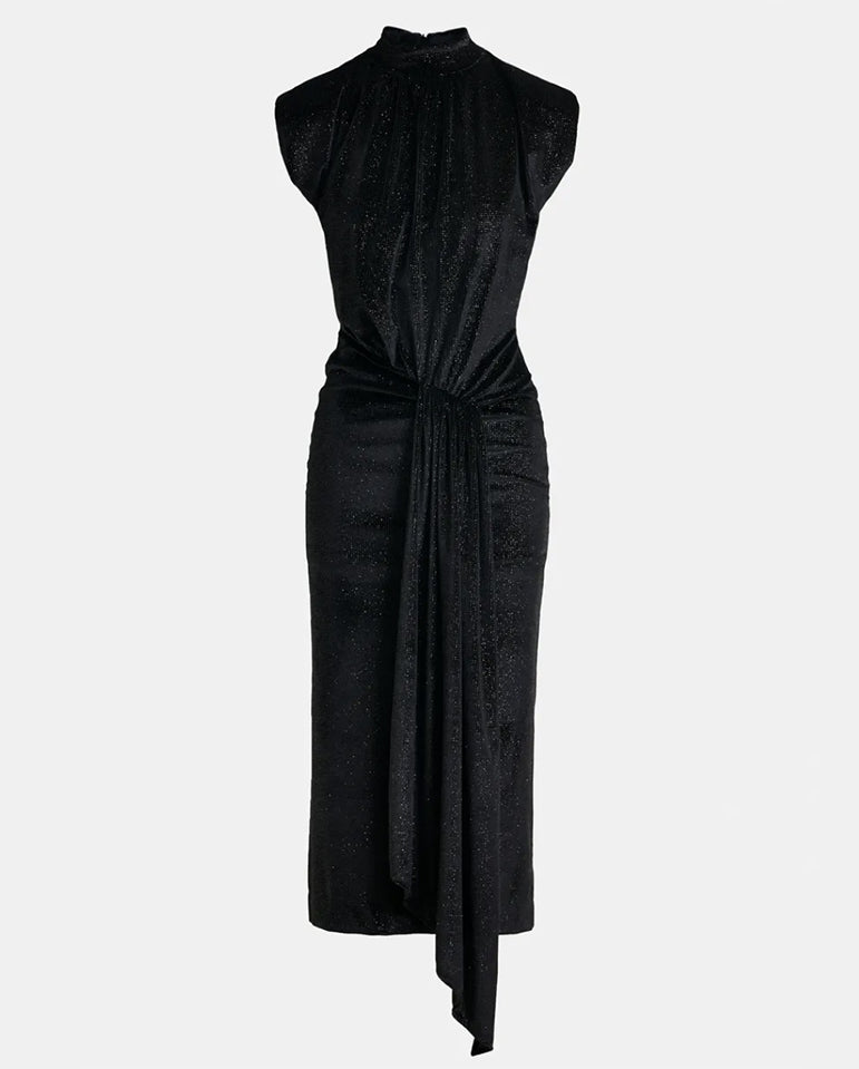 Embrace party season with an Essentiel Antwerp frock... Essentiel Antwerp midi dress embellished with black-tone dots for a glitter-like finish. Features a wrap-inspired skirt with box pleat gatherings at the front and a generous split, finished with lightly padded shoulders...