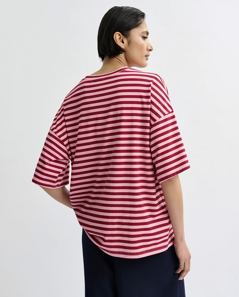 Life won't sparkle unless you do... Soft cotton T-shirt cut for a boxy, oversized silhouette, featuring short sleeves and a clean round neckline. Crafted in a striped two-color design with rhinestones scattered all over, wear it tucked into tailored trousers...