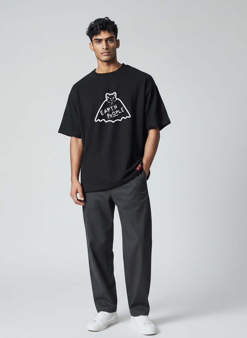 Add an Earth People graphic into your daily tee rotation... Black T-shirt with Earth People bat graphic on the front, designed for a slightly oversized fit. Finished with a bound style neckline and red woven patch sewn on the front....