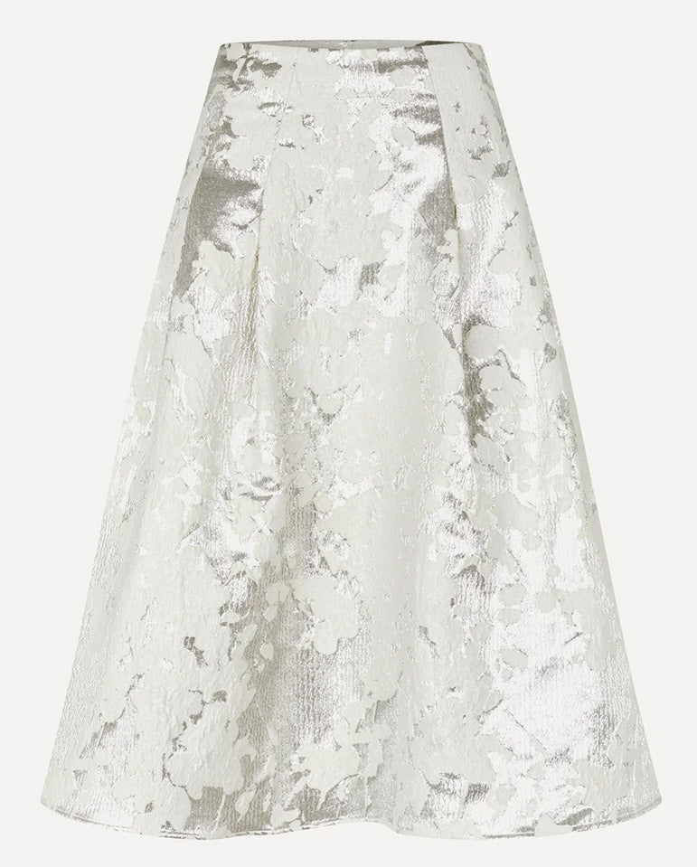 Make the occasion special with Stine Goya... Ankle-length skirt crafted in structured organza with a silver and off-white floral jacquard pattern. Designed with pleats for volume, a fitted waistband and side pockets.Made from 58% Recycled Polyester, 22% Metallic, 20% Nylon....