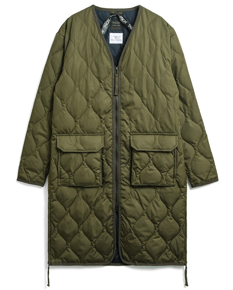 A best seller in Taion's Military line, you will be thankful for this coat as the days cool... V-neck double-zip down coat crafted from durable ripstop fabric, filled with 800FP down for excellent heat retention. The zipper can be opened...