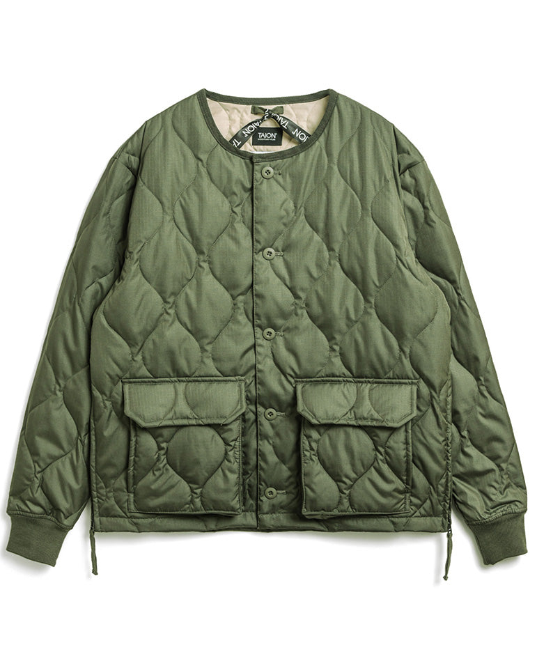 Button up, and head out... Relaxed military down jacket crafted from durable ripstop fabric, filled with 800FP down for excellent heat retention. The loofah-quilted down stitching adds a classic military touch, while side slits increase mobility and allow for easy access...