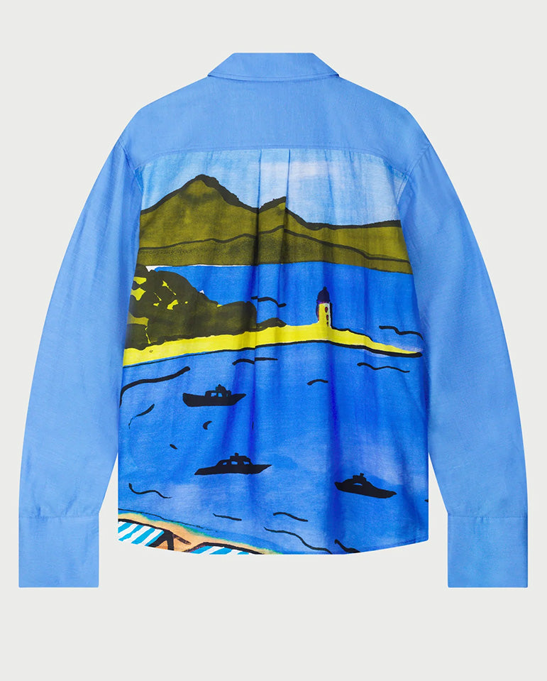 Bring sun and sea with you, whatever the endeavor this summer... The Navina Blouse is presented in a bold blue with a scenic print on the back. Designed for a relaxed, loose fit with adjustable ruffled drawstring details along the...