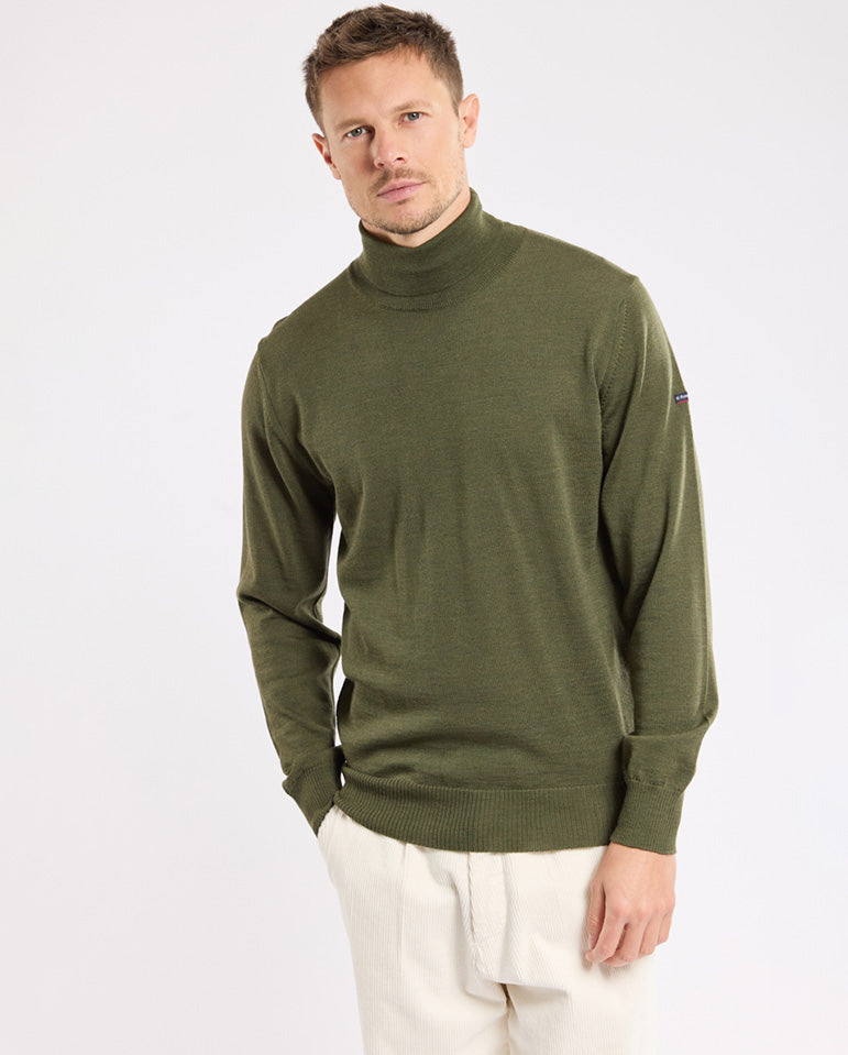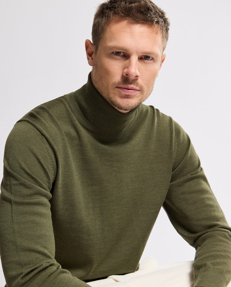 This wool turtleneck jumper will be your ally this winter... Long-sleeved, high-neck jumper in this season's olive green. Designed in pure wool as single layer 1x1 rib roll-neck collar and 2x2 ribbed cuffs and hemline.  Made from 100% wool. See...