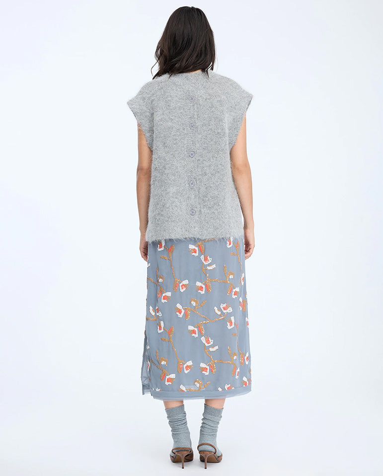 Soft and lightweight, an interesting layer from Munthe to add to your winter knits... Knitted vest with a V-neckline at the front and decorative buttons along the back for a unique twist. Perfect for layering over shirts or dresses. Made...