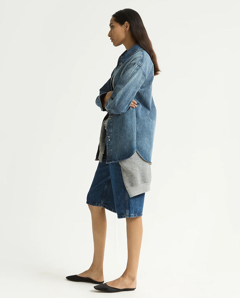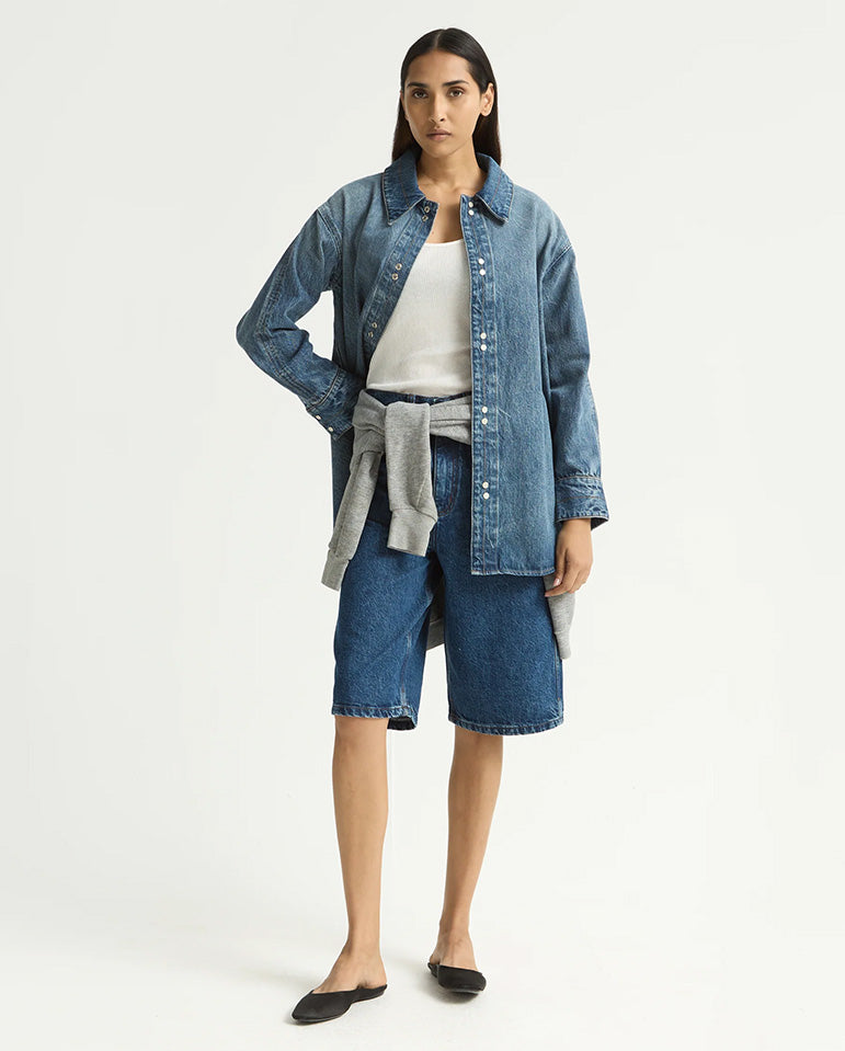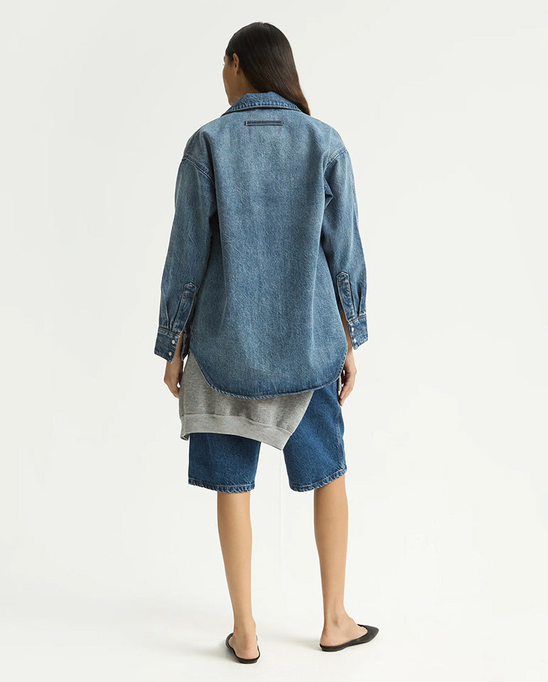 Classic collar denim shirt with snap buttons and long sleeves. Crafted from rigid Italian denim in a low impact wash.